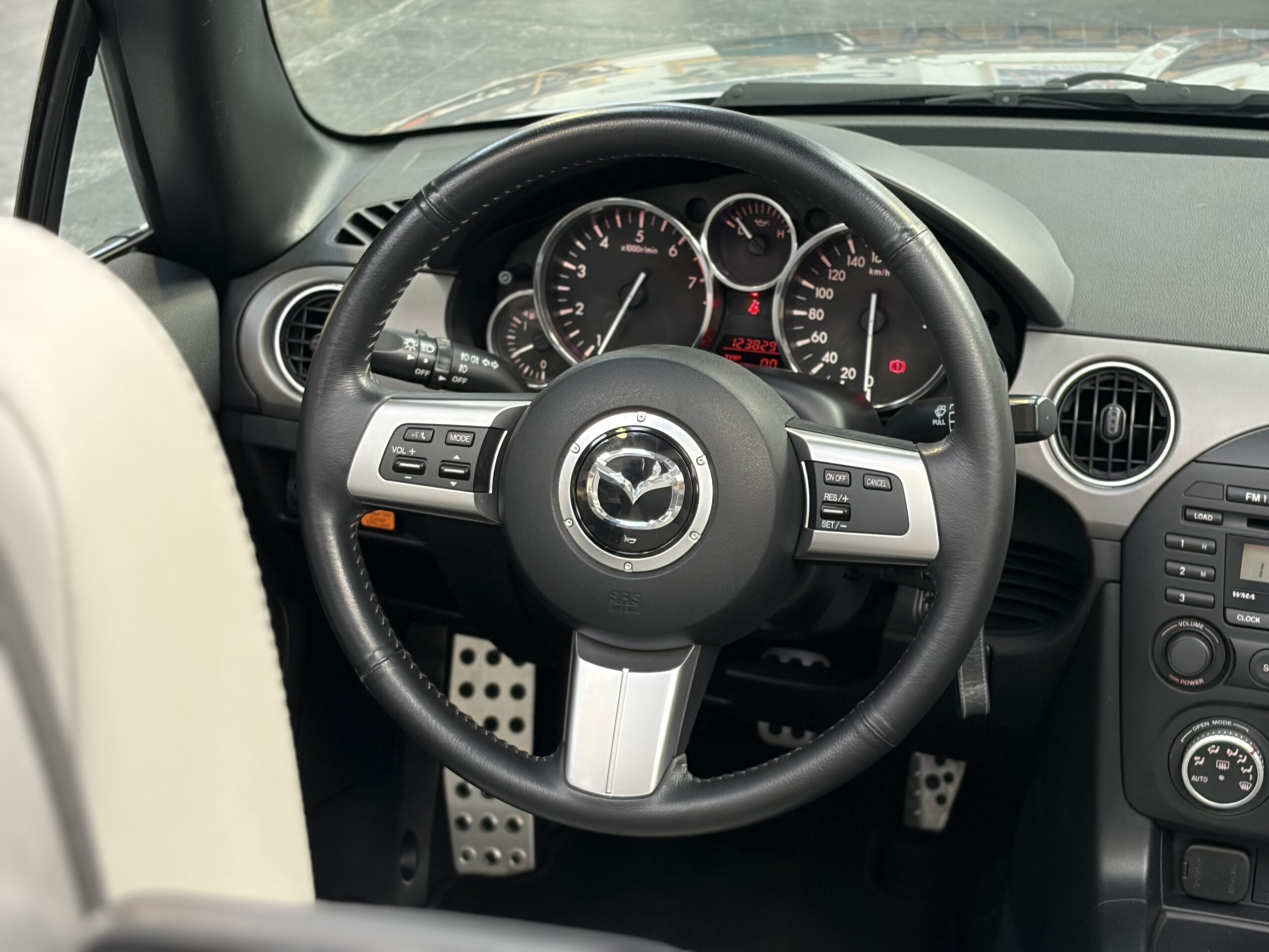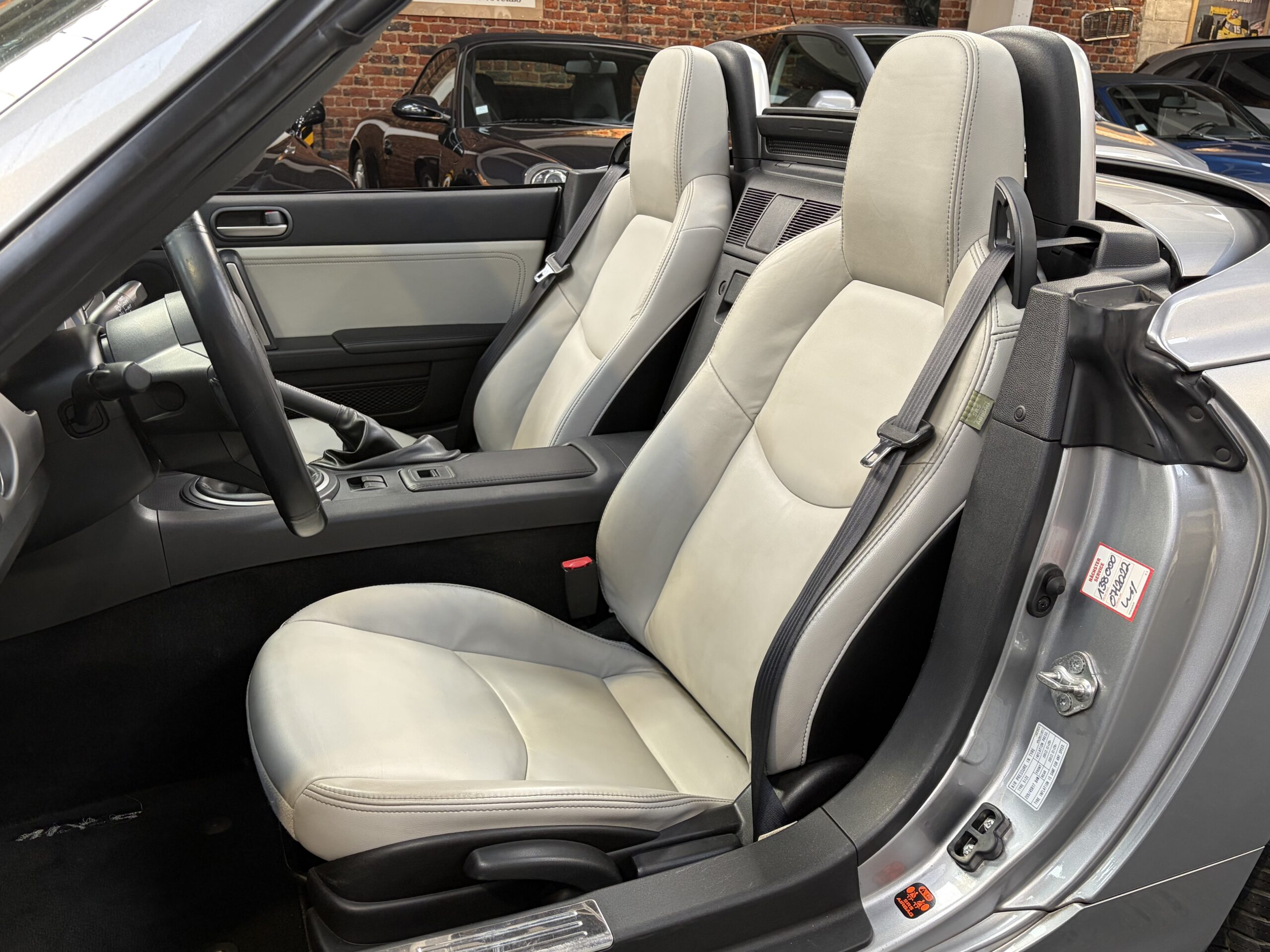 Dans sa finition limitée Kaminari à 900 exemplaires, cette MX5 s’équipe d’options spécifiques : gris Aluminium 38P, jantes 17 pouces, pack chromes extérieurs, sellerie en cuir gris, entre autres.